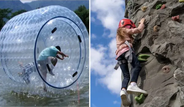 - Mini rope bridges, climbing walls, and obstacle trails